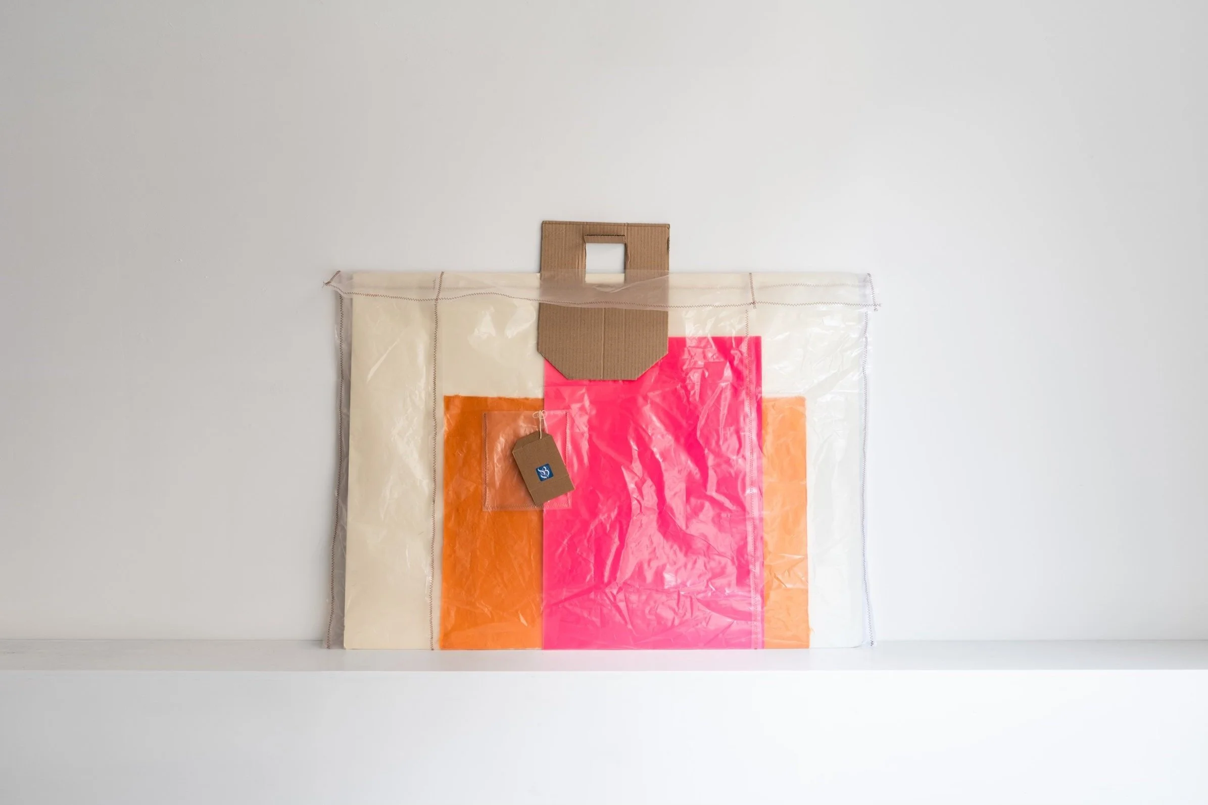Nicoline startte haar onderzoek met ver pakkingsmateriaal van karton, maar de verschillende producten waren niet erg sterk en niet regenbestendig. Het meest handig voor de gebruiker bleek een hele grote plastic tas te zijn. “Tussen de afvalmaterialen bevindt zich stevig plastic, namelijk zakken die om de rolcontainers zitten. Hiervan komen er wekelijks 1 à 2 binnen.” Dit is stevig materiaal dat opengeknipt ongeveer 420 cm x 220 cm is. Hiervan is ze tassen met een overflap gaan naaien. Het handvat maakte ze van karton. Dankzij de zakjes die op sommige tassen zitten, kan er een reclameuiting van Van Beek in worden gedaan. Ook is mogelijk om er een logo op te zeefdrukken. Dit is ook mogelijk voor andere winkels.